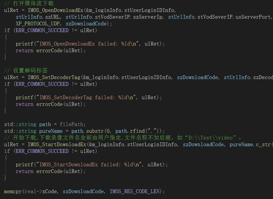 4)通过SDK流程图可以发现,下载分为2个分支:一种是直接下载录像;另一种是捕获数据进行下载。为了以防万一,在封装调用接口时,也需要进行二次封装(下载录像和数据流的方式);