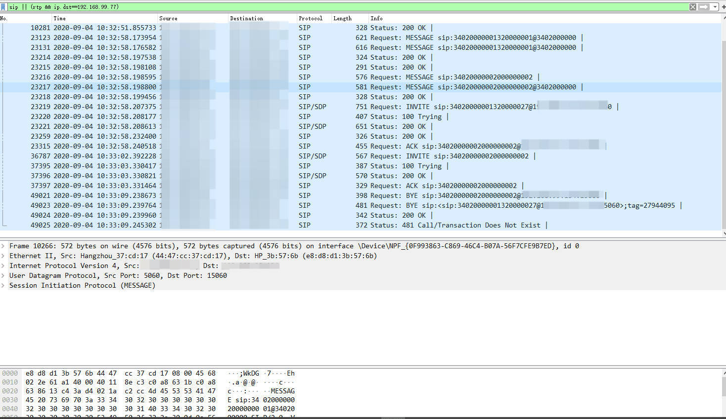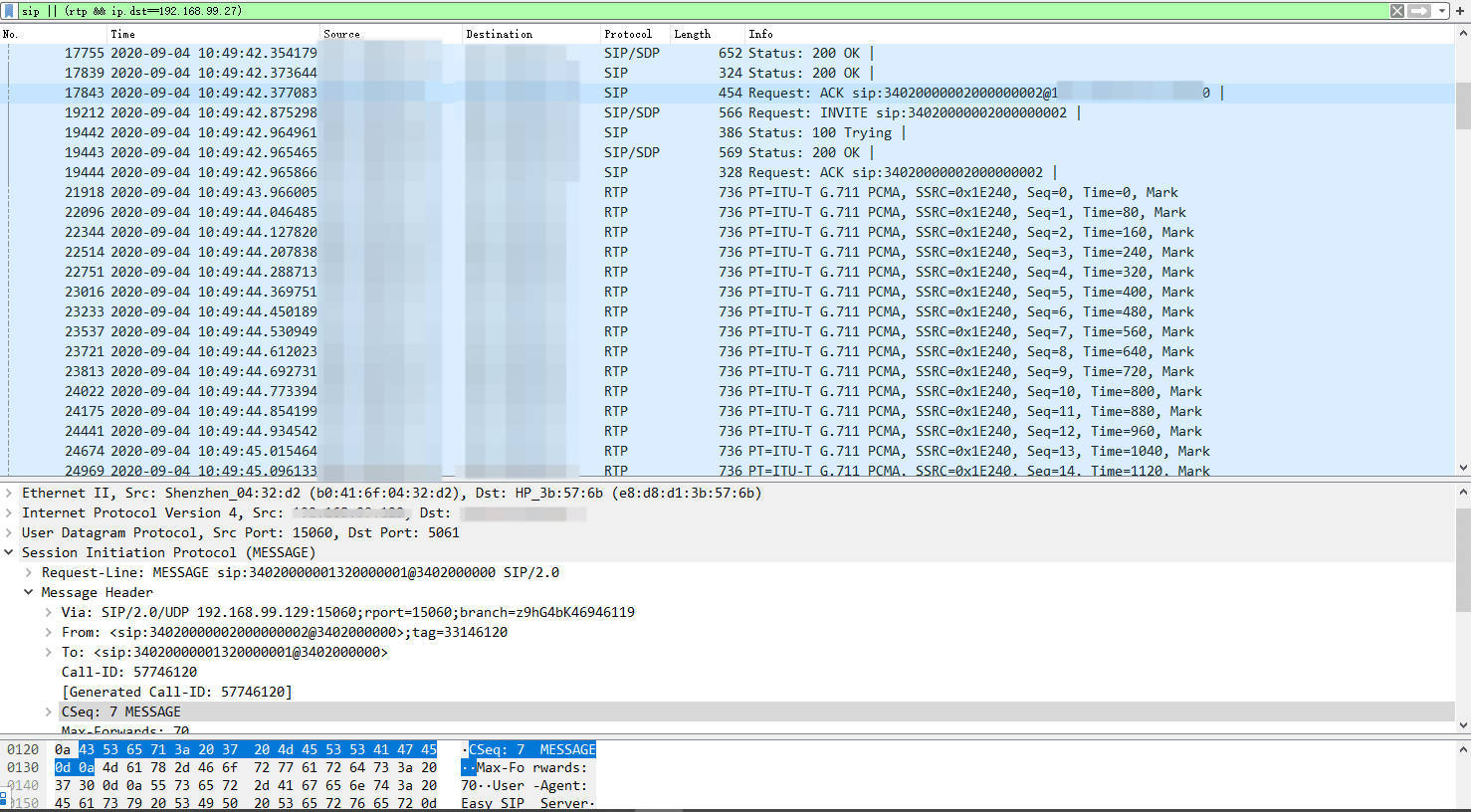 发现语音通知命令<CmdType>Broadcast</CmdType>\n和设备初始化注册命令CSeq: 15 INVITE都正常,包括上级平台的语音都已经成功发送到下级平台,所以,可以判断是下级平台在向设备发送语音时,出现了问题。