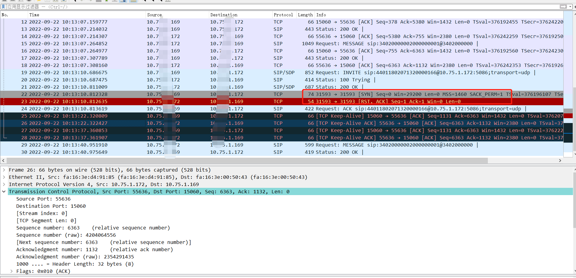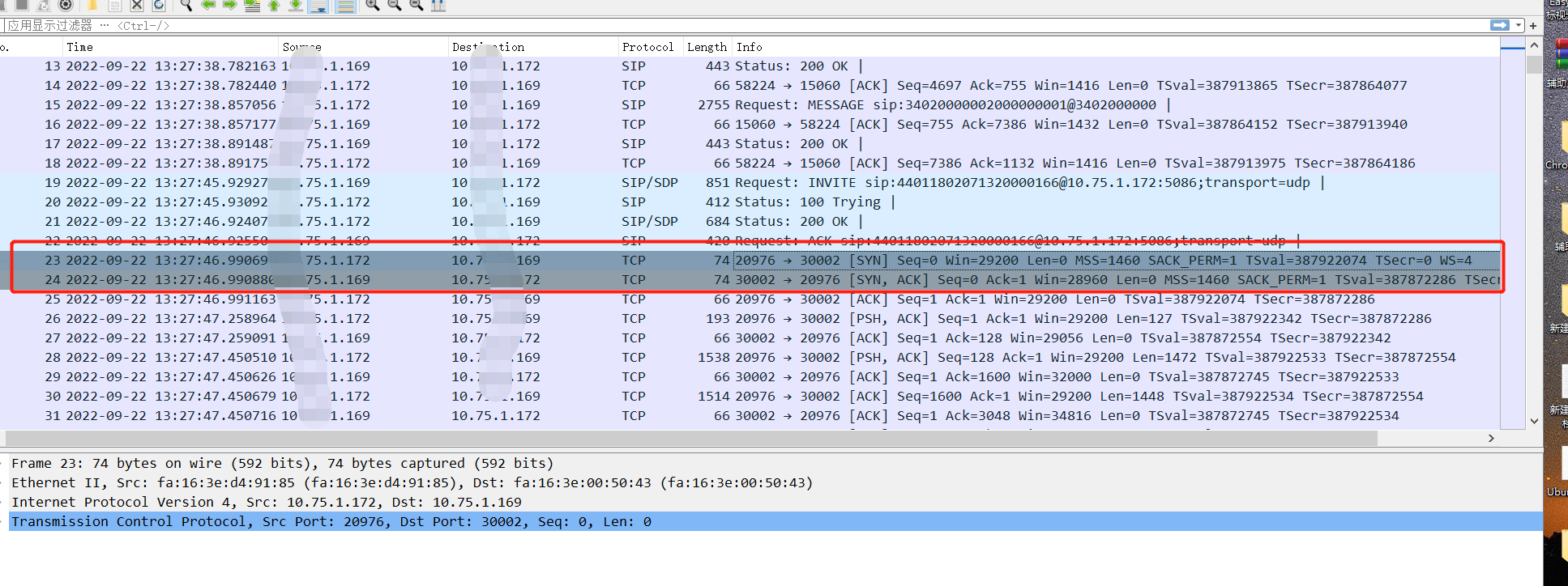 从数据包中查看平台发送invite请求播放录像消息,设备这边回复200ok的请求流程是正常的,但是请求之后可以看到设备没有发流。随后从数据包里分析,正常请求播放视频之后,平台发送了syn的交互信息,应该是设备主动发送的。