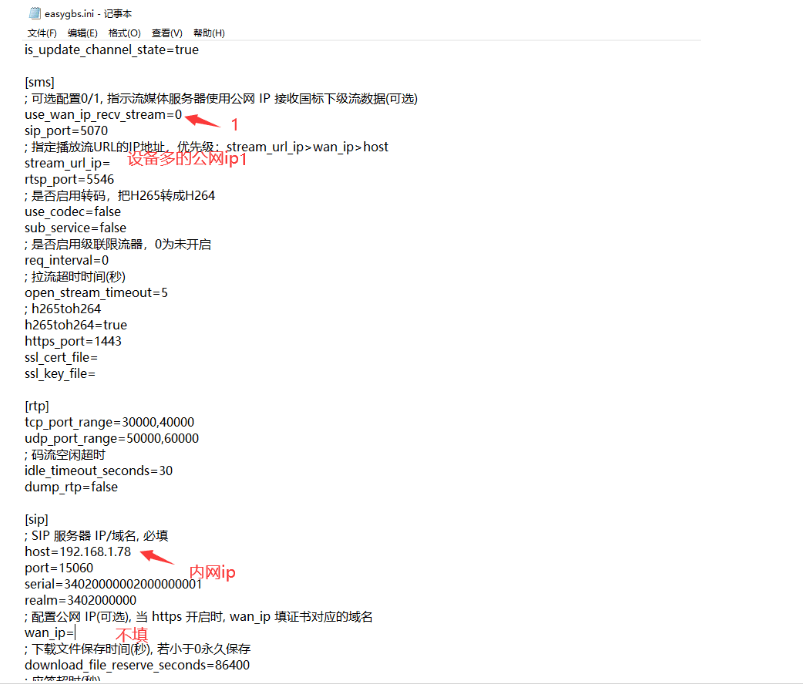 1)配置easygbs.ini文件,将use_wan_ip_recv_stream的值改为1,stream_url ip填写设备多的公网IP地址,host填写内网IP,wan_ip不填写,具体如图: