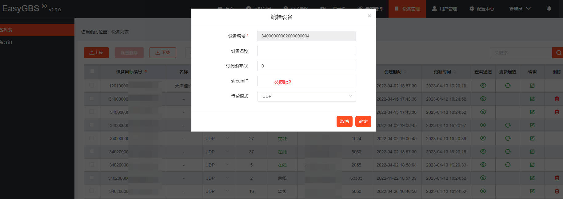 2)在EasyGBS平台设备页面,选择需要走公网ip2的设备,收流地址(streamIP)则填写公网ip2,如图: