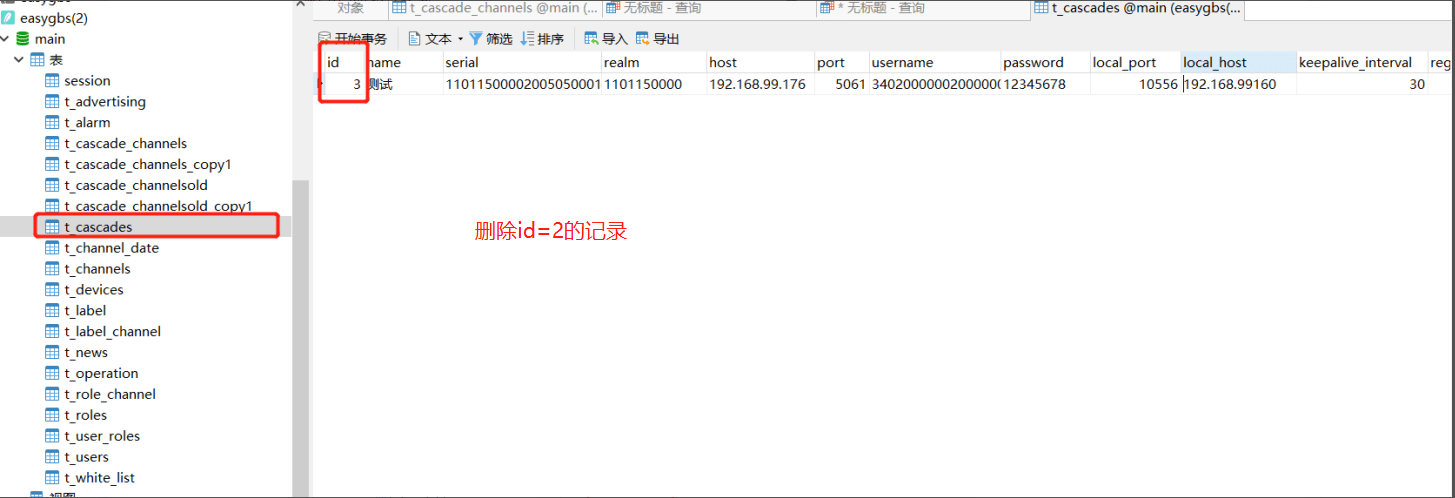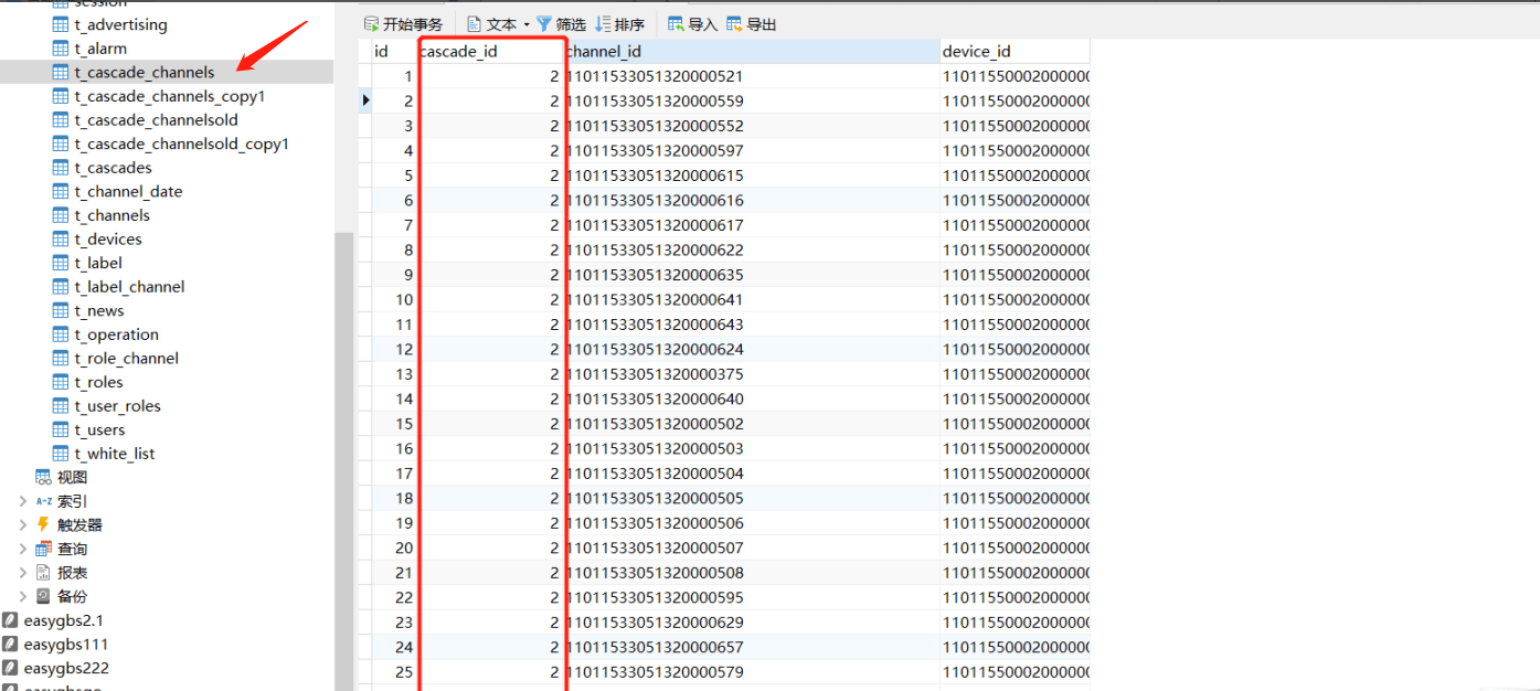 EasyGBS级联记录中添加关联的设备后,删除该条级联记录却并不会删除该条记录所关联的设备通道,导致数据库t_cascade_channels表产生大量的垃圾数据,影响数据操作效率,如图所示: