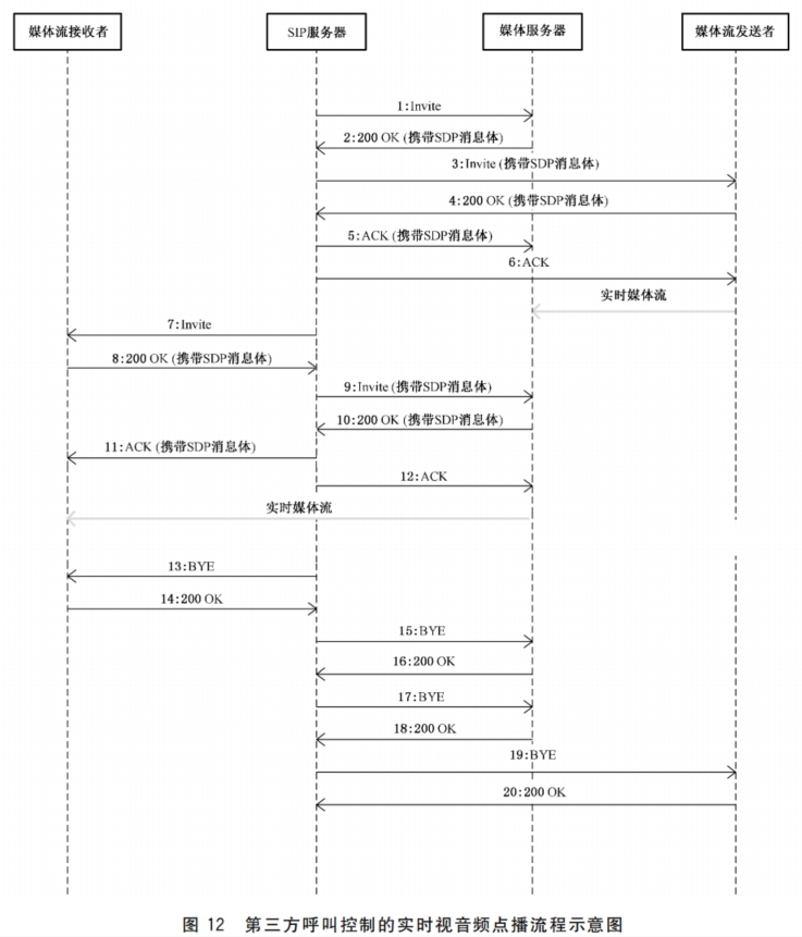 其中,信令1-6为SIP服务器通过三方呼叫控制建立媒体服务器与媒体流发送者之间的媒体链接信令过程,信令7-12为SIP服务器通过三方呼叫控制建立媒体流接收者与媒体服务器之间的媒体链接信令过程,信令13-16为断开媒体流接收者与媒体服务器之间的媒体链接信令过程,信令17-20为断开媒体服务器与媒体流发送者之间的媒体链接信令过程。