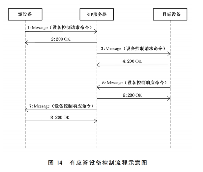 7、SIP服务器向源设备转发设备控制响应命令,设备控制响应命令采用Message方法携带;