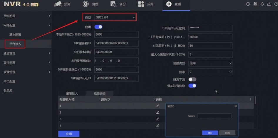 提醒:只有录像机支持外接报警输入,才支持配置“报警输入编码ID”。