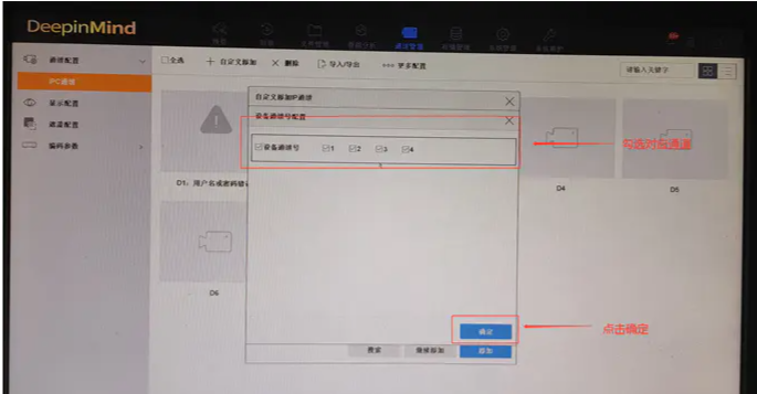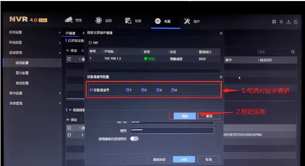 2、点击“添加”后会出现设备通道号配置界面,勾选需要添加的通道,点击“确定”即可。