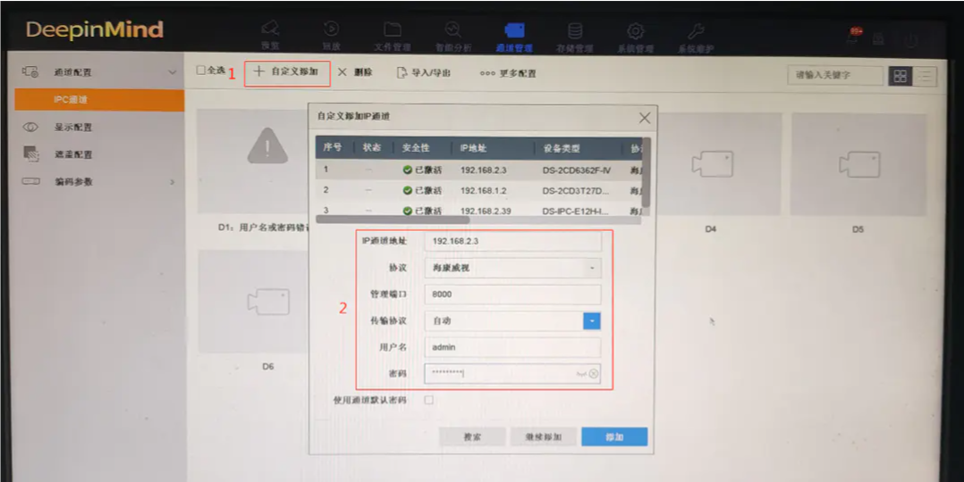 1、进入“配置—通道管理—通道配置—IPC通道”界面:点击“自定义添加”,输入摄像机IP地址(或者列表选中需添加的摄像机)、协议(海康摄像机默认海康协议)、管理端口(海康摄像机默认8000)、用户名(默认admin)、摄像机密码,点击“添加”。