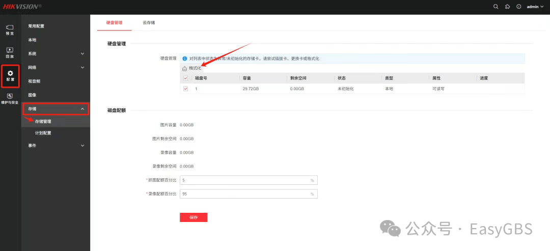 那最后就跟大伙儿说说具体咋操作:首先进入设备后台,找到【配置】-【存储】-【存储管理】,在硬盘管理页面全选,点击格式化就搞定了!