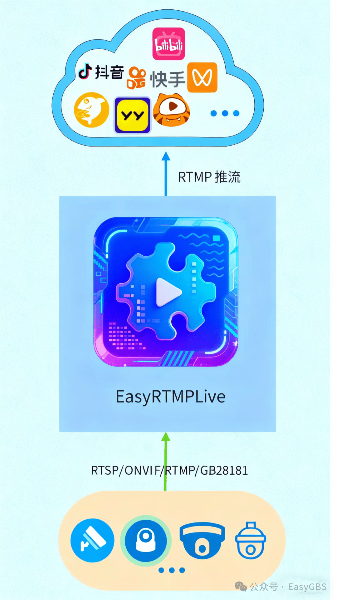 之前我们在很多客户项目中,用户想将摄像机的实时视频以RTMP推流直播的方式,推送到第三方平台,例如阿里云、腾讯云、视频号、B站等,在以前要做这个事情相对来说比较受制约,要求视频源必须是RTSP这种拉流地址,像那种GB28181、RTMP推流过来的视频,就跑不起来这个逻辑了。