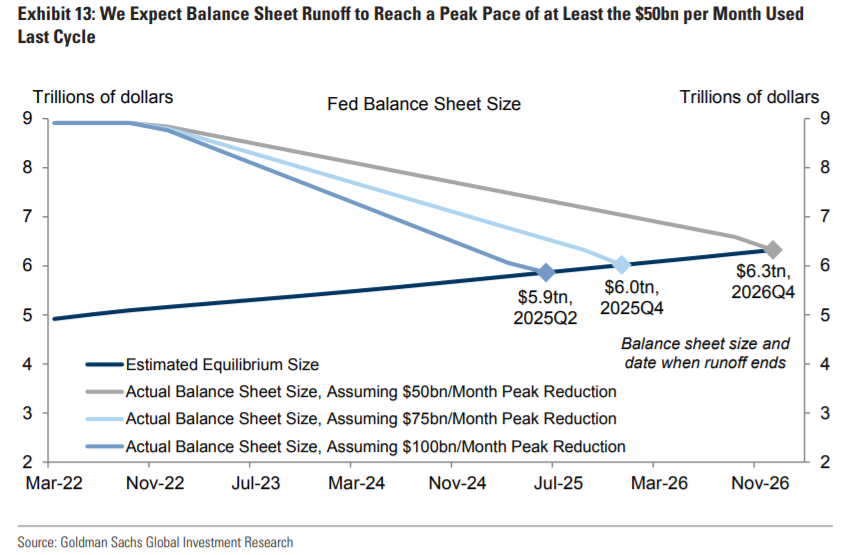 高盛预计,此次美联储缩减资产负债表的表现,可能会比前一次金融危机过后那时来的更果断、更大胆,或将从36%缩减到21%,约占GDP的15%。