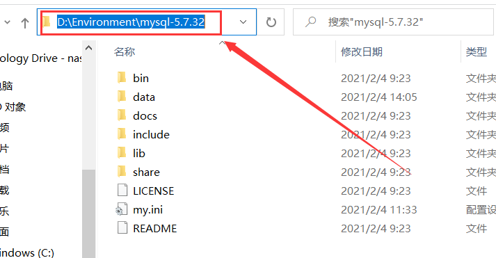 建议将解压缩所得到文件夹放到自己放置开发环境软件工具的文件夹中,并重命名文件夹:将mysql-5.7.32-winx64修改成mysql-5.7.32。