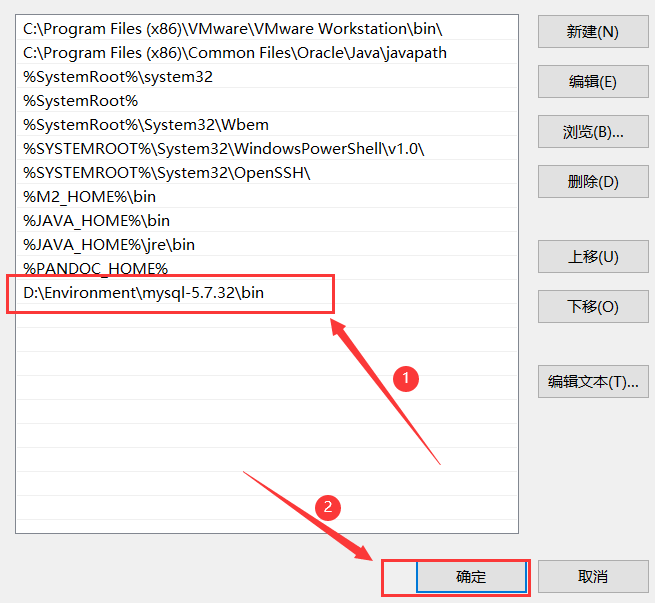 在弹出的编辑框中,双击下方空白的栏位,填入刚才MySQL安装位置下的bin文件夹的位置。点击确定。