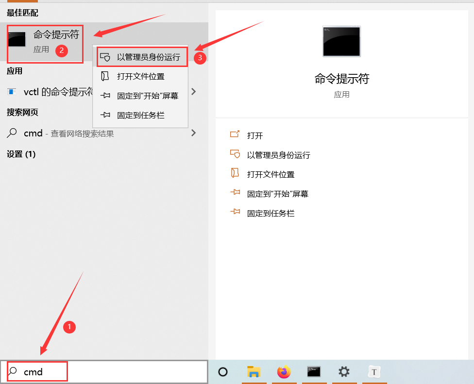 使用管理员模式打开命令提示符(CMD),Windows10 搜索框输入cmd,鼠标右键点击结果命令提示符,选择以管理员身份运行。