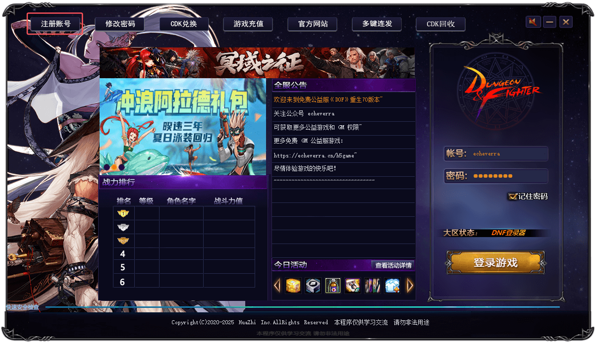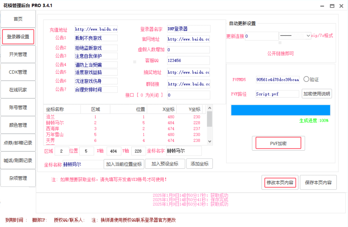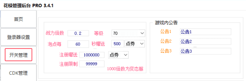 花枝登录器很强大,可以对游戏进行一些设置,比如初始点券、公告信息、CDK、邮件发送等等,测试都是生效的。