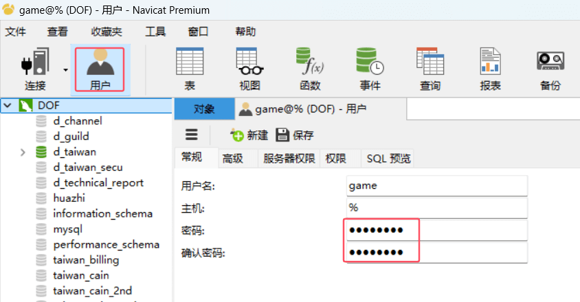 ,将数据库管理工具解压打开启动,填写数据库账号密码连接上后,点击用户,将game@%