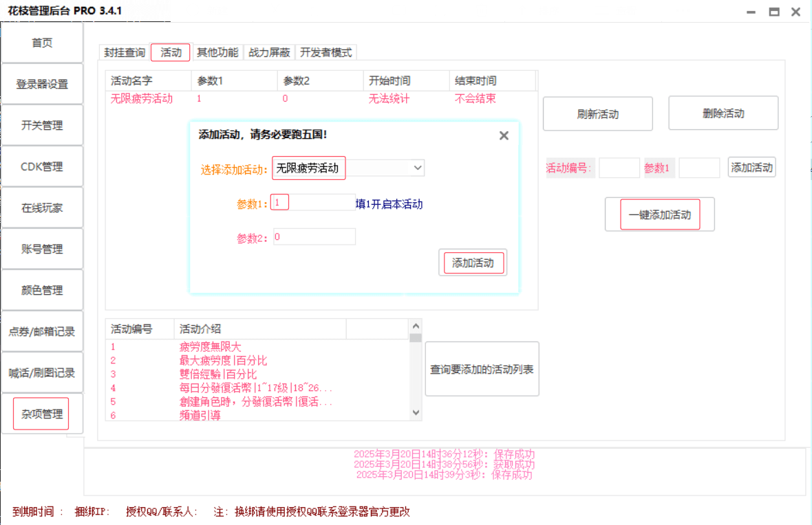 无限疲劳设置需要点击杂项管理中的活动,点击右侧一键添加活动,在弹窗中选择无限疲劳活动,参数 1 填写 1 即可,然后点击添加添加活动,重新启动游戏即可,这样刷图就不会消耗疲劳啦~