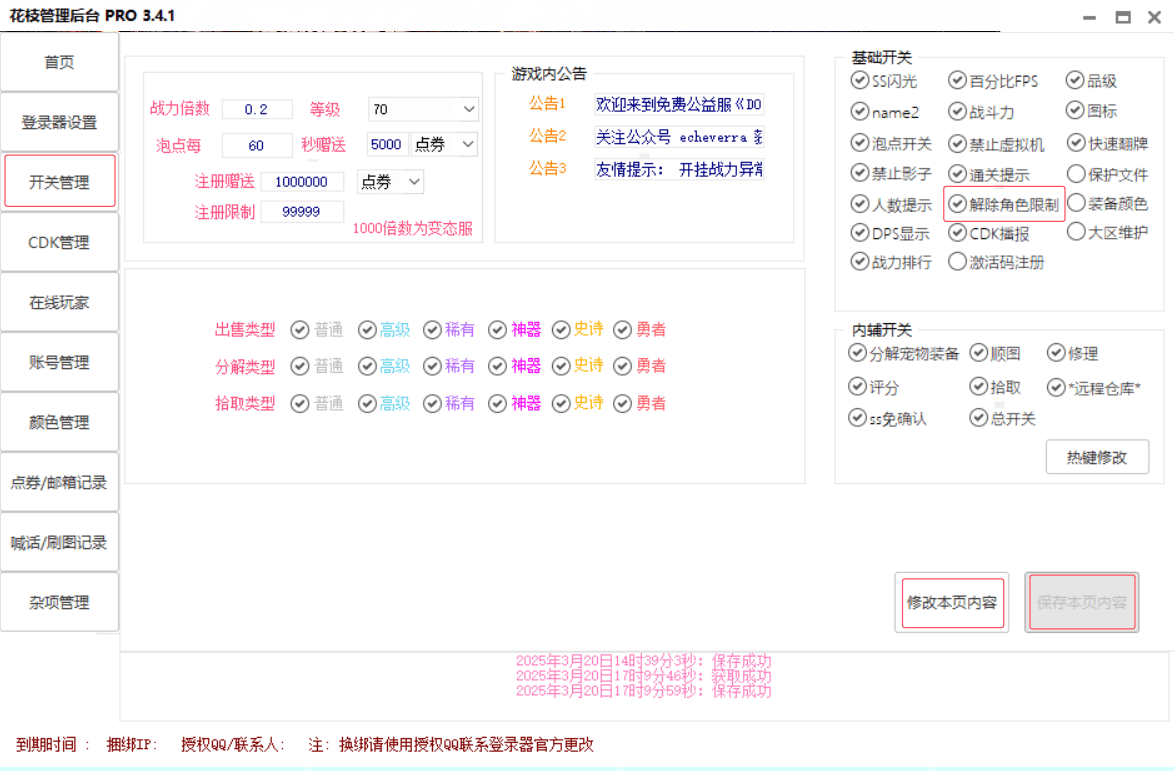 这两个设置可以通过花枝登录器后台管理工具设置,打开花枝登录器3.4.1\后台管理工具\后台管理工具3.4.1.exe,点击开关管理,再点击右下角修改本页内容,将解除角色限制勾选上,最后点击保存本页内容,这个不需要重新启动游戏,就可以创建多角色。