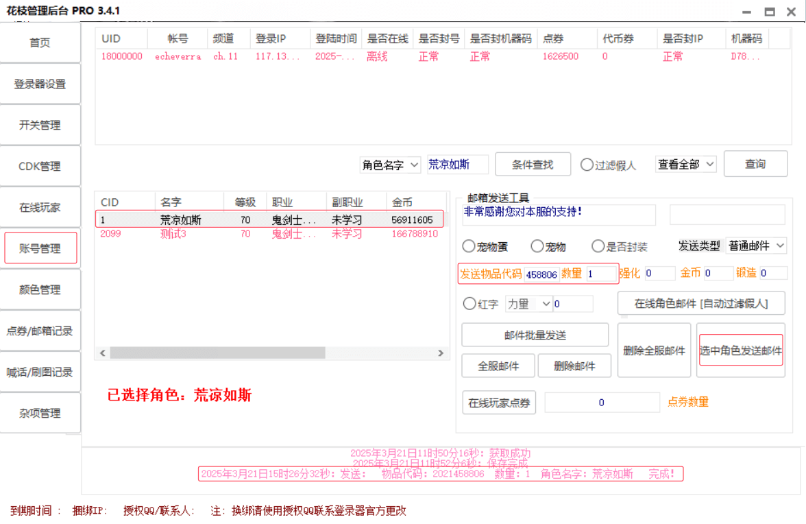启动成功后,我们来测试下,还是打开花枝登录器后台管理工具,我们给角色发送一个宠物清理券,代码是2021458806,后面我会教大家怎么来查看物品代码哈。