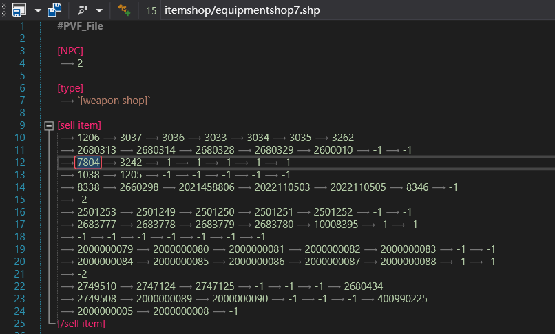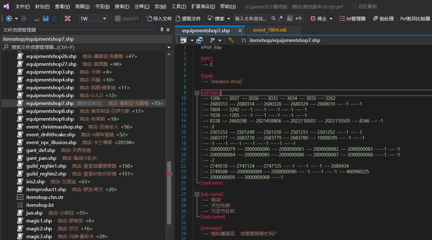 首先我们需要使用补充资源中的pvf工具\pvfUtility\pvfUtility.exe,双击打开 PVF 编辑器,左上角文件打开封包,找到 PVF 版本文件打开,找到文件itemshop/equipmentshop7.shp,这个就是赛丽亚的商店了。