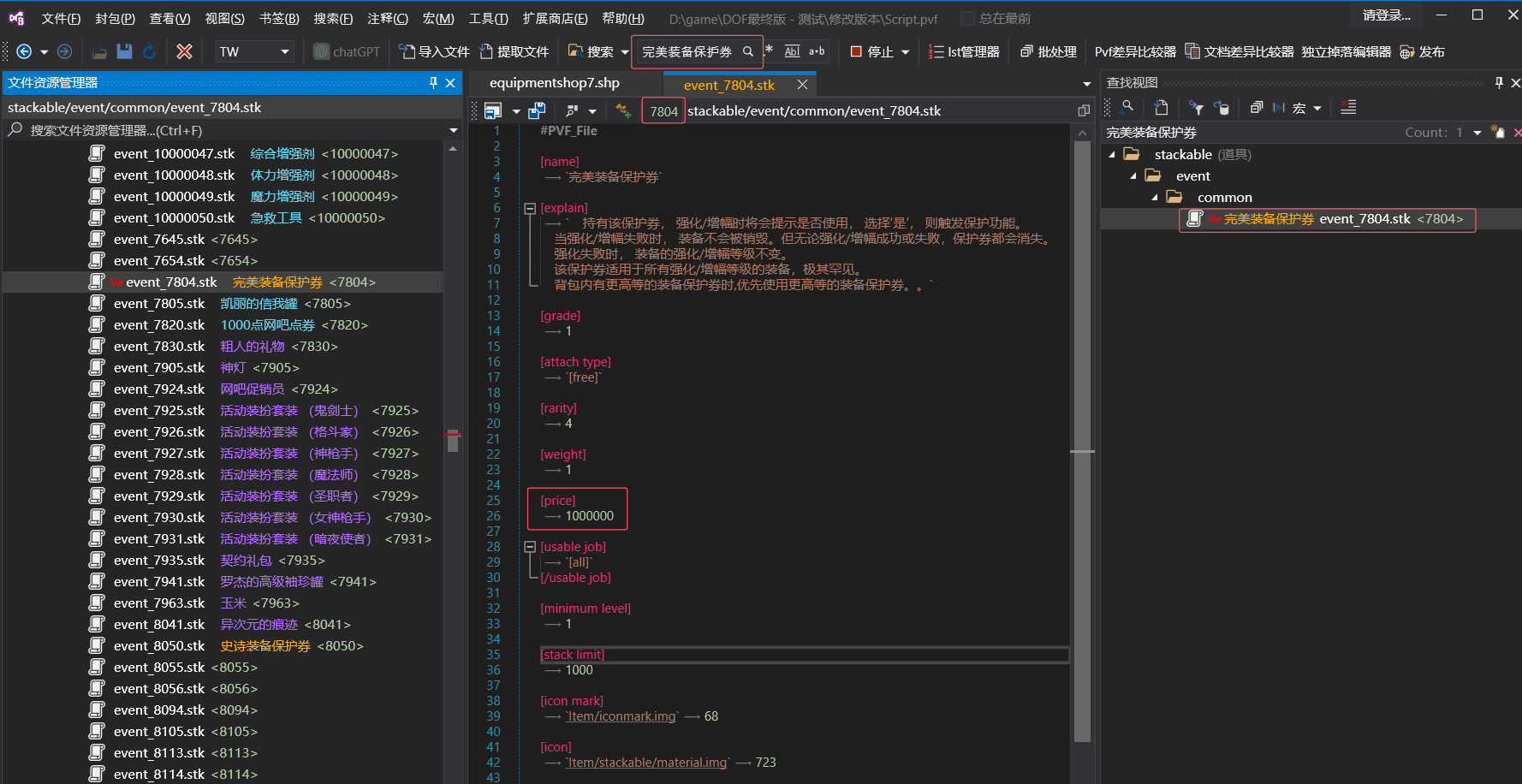 那怎么查找物品代码呢?比如我们想找完美装备保护券,那就上方搜索,找到对应的文件打开。