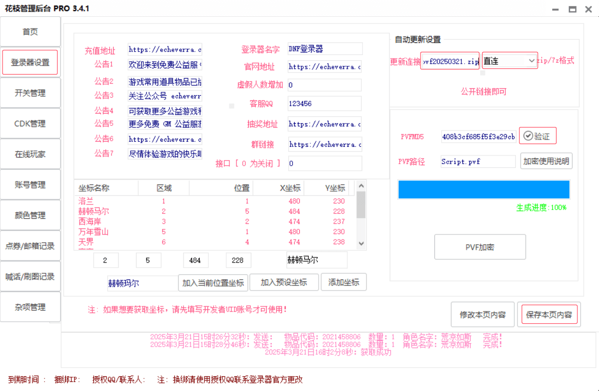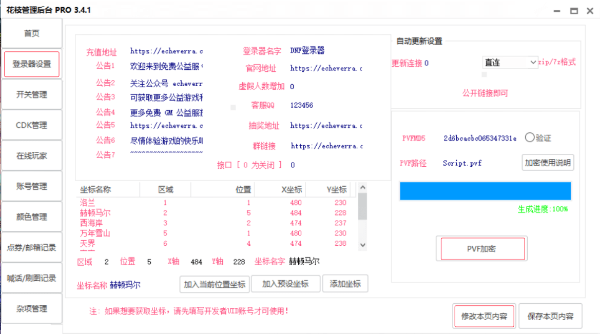 再次打开花枝登录器后台管理工具,登录器设置界面,点击修改本页内容,然后再点击 PVF 加密,选择修改后的Script.pvf文件,加密后会生成一个新的Script.pvf文件。