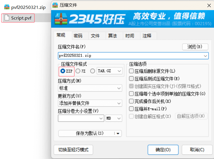 我们将这个新的Script.pvf文件压缩成 ZIP 格式的文件,命名随意。