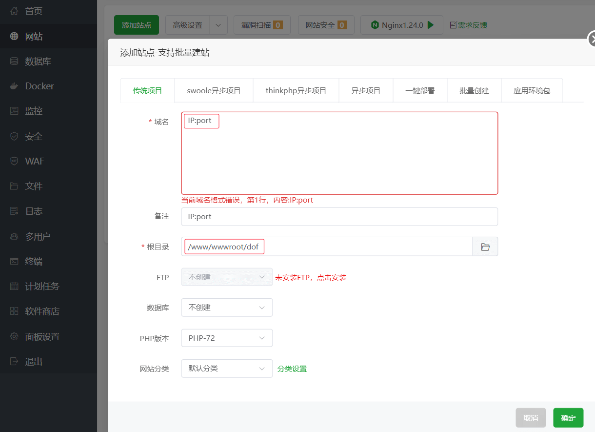 然后我们要将这个新生成的 ZIP 文件通过直链的方式获取到,由于压缩文件 100M 多一点,玩家下载对服务器负担还是比较大的,所以我放到了我的资源服务器中。将 ZIP 压缩文件上传到资源服务器目录/www/wwwroot/dof,再创建一个站点,域名设置为你资源服务器的 IP,port 端口不要被占用就好,路径选择/www/wwwroot/dof,这样我们就可以通过http://IP:port/xxx.zip直链的方式访问到压缩文件啦。
