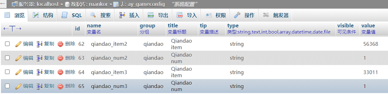首先在 PhpMyadmin 中找到数据库ruankor表ay_gameconfig,执行 sql 语句: