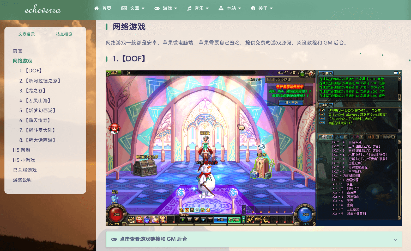 我的第一个博客网站:https://echeverra.cn,记录我的工作生活,当然更多的是游戏架设教程。一转眼已经 4 年了,4 年来我一直在坚持研究游戏,我将所有的已开服的游戏都写在了文章:https://echeverra.cn/h5game。