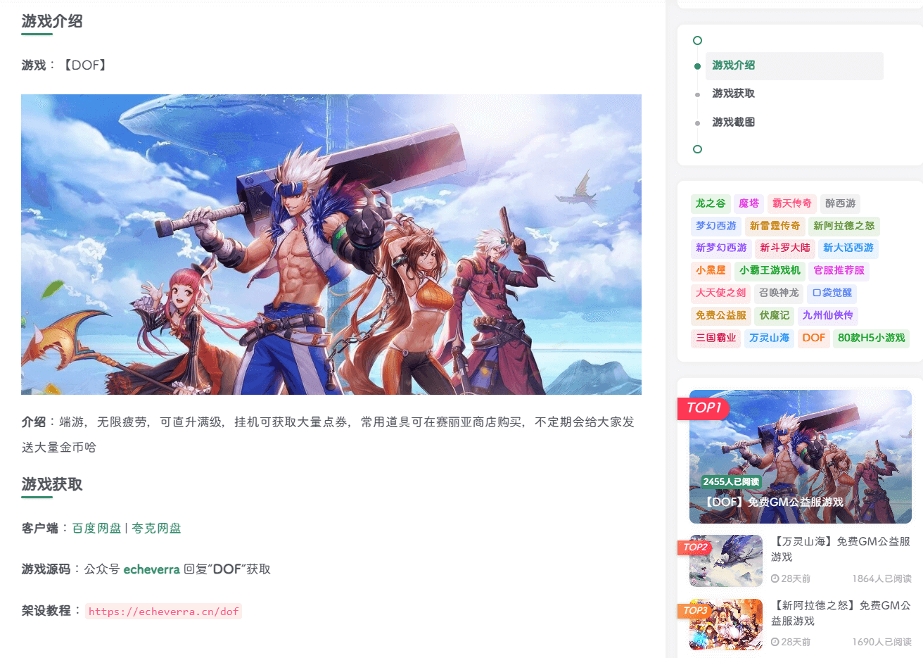 网站的游戏类别有两种,第一种就是我自己架设发布的公益服游戏,平均每月会发布 1 到 2 个精品的公益服游戏,同时会免费分享该游戏的源码和架设教程。对于我自己的公益服游戏,我可以拍着胸脯对大家做出 5 点承诺保证: