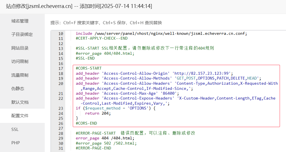 然后在资源服务器上创建可访问的资源站点,域名填写IP:port,IP 为资源服务器 IP,端口 port 不要使用已占用的端口,根目录选择/www/wwwroot/jzsml。创建完后需要修改配置文件,使得可以游戏服务器可以跨域访问到资源服务器的文件。