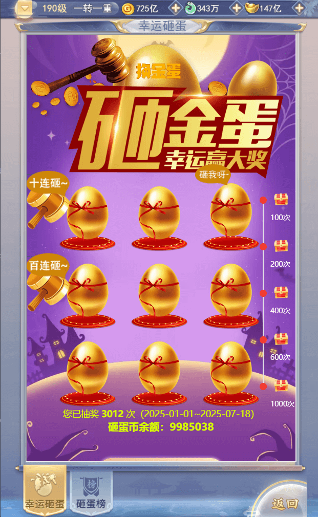游戏可以配置砸蛋活动,需要更改下游戏活动时间,需要修改数据库backstage_zz中表ny_cjsysconfig的开始时间字段jianglistarttime和结束时间字段jiangliendtime,按照原有格式修改,然后重启游戏即可。