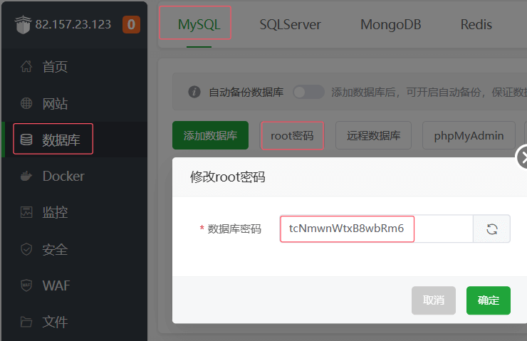 再修改 MySql,宝塔数据库菜单中,将 MySql 的 root 密码改为:tcNmwnWtxB8wbRm6。