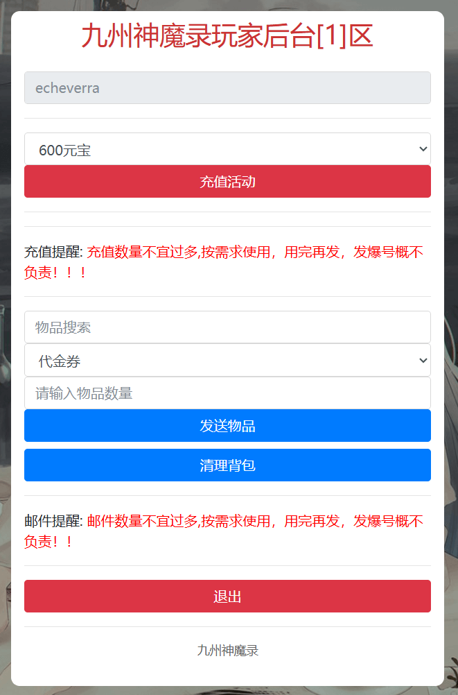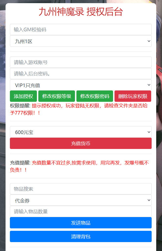 玩家后台链接:http://IP:88/gm/,授权过的玩家就可以充值和发送物品啦。