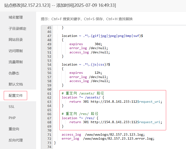 因为源码中没有具体设置assets和res的路径,没办法单独修改,所以我们只能采用重定向的方式。修改游戏服务器的站点IP:88,添加重定向代码: