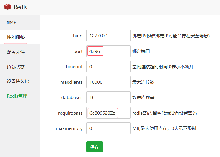 首先修改 Redis,在性能调整中将端口 port 改为 4396,将密码 requirepass 改为 Cc809520Zz。