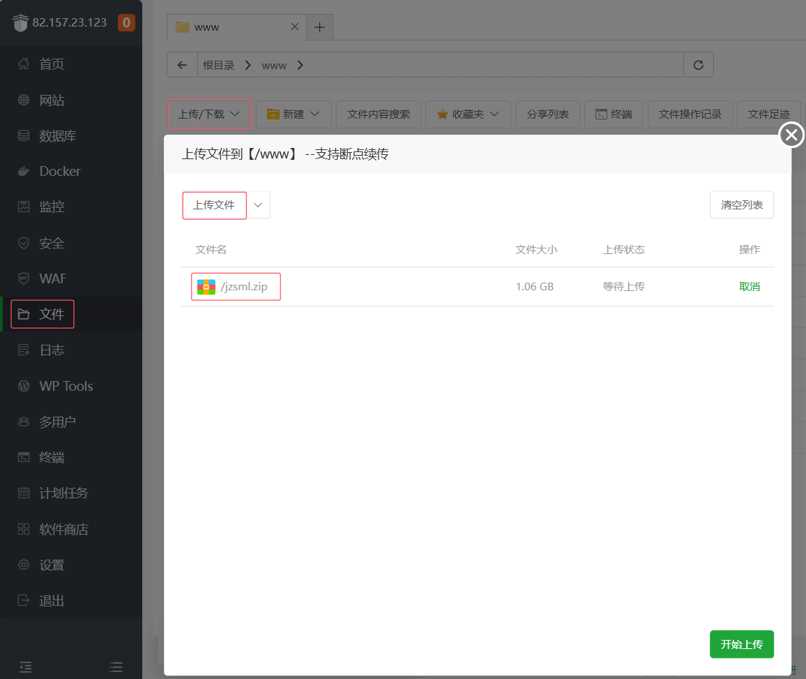 拿到源码后,将jzsml.zip压缩文件通过宝塔上传到根目录,由于最新的宝塔禁止直接上传到根目录,可以先上传到任一目录下,再剪切粘贴到/根目录。或直接通过 finalshell 工具直接上传到根目录也可以。