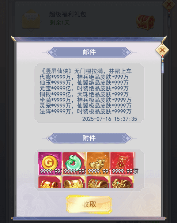 第二处是新创建游戏角色,会自动收到一个超级福利礼包邮件,各种 99999 数量的礼盒道具,试了下游戏直接卡死,所以我去除了这个邮件。