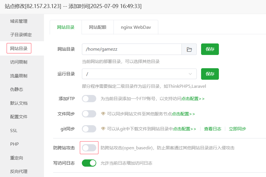 最后分别点击这 4 个站点进行修改,在网站目录中将防跨站攻击全部都关闭掉。