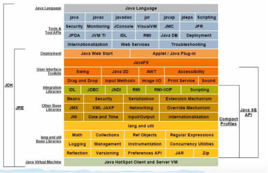 JRE(Java Runtime Envirnment)、一堆Java工具(javac/java/jdb等)和Java基础的类库(即Java API 包括rt.jar)。