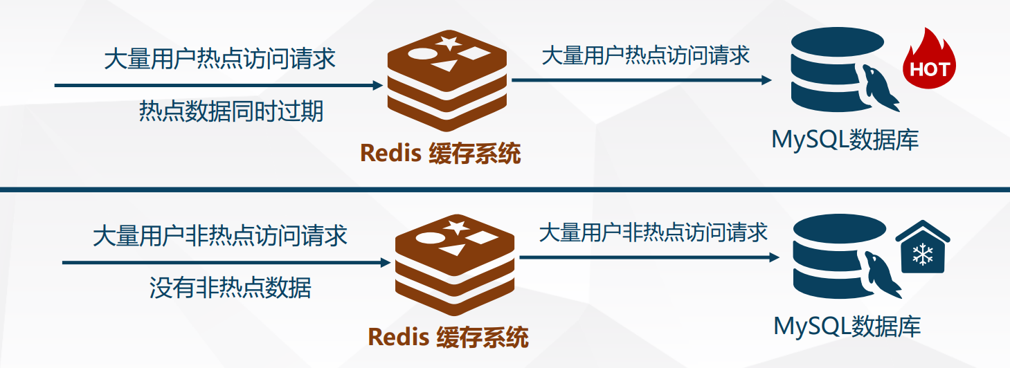 缓存击穿是指Redis 缓存中有一些的热点数据key同时过期失效,或有一些非热点数据key 突然有大量并发访问请求,这样会导致大量并发请求直接穿透 Redis缓存,涌入MySQL 数据库,瞬间增大数据库的访问压力,甚至导致数据库崩溃