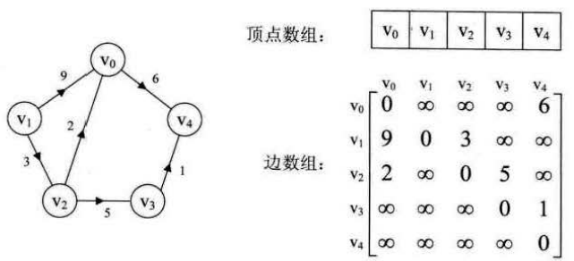 下图是一个带权值的有向图(又称为有向网)的邻接矩阵表示,两个顶点之间若连通则二维数组 对应位置为边上的权值,否则为无穷大,并且二维矩阵的对角线为0(当然也可以设置为无穷大)