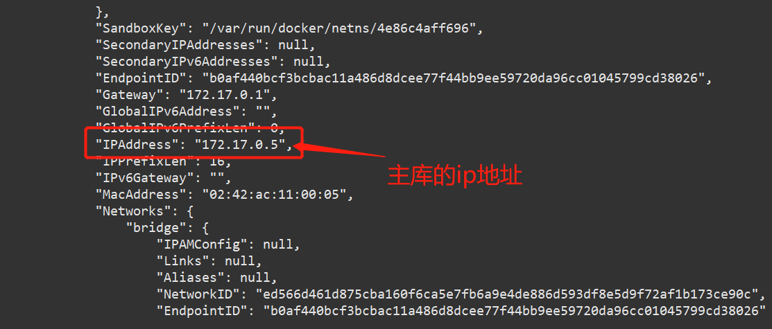 在后续的配置中,我们需要使用到主库容器的ip地址,因此,我们需要使用如下的docker命令获取容器的ip地址: