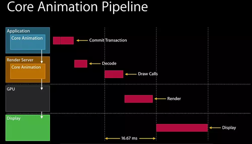前面提到Core Animation Pipeline是以流水线的形式工作的,在理想的状况下我们希望它能够在1/60s内完成图层树的准备工作并提交给渲染进程,而渲染进程在下一次VSync信号到来的时候提交给GPU进行渲染,并在1/60s内完成渲染,这样就不会产生任何的卡顿。