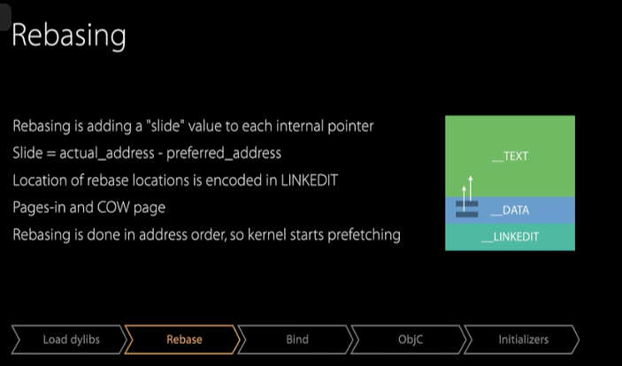 Rebase在前,Bind在后,Rebase做的是将镜像读入内存,修正镜像内部的指针,性能消耗主要在IO。Bind做的是查询符号表,设置指向镜像外部的指针,性能消耗主要在CPU计算。