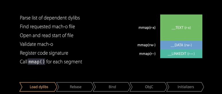 这一阶段dyld会分析应用依赖的dylib(xcode7以后.dylib已改为名.tbd),找到其mach-o文件,打开和读取这些文件并验证其有效性,接着会找到代码签名注册到内核,最后对dylib的每一个segment调用mmap()。
