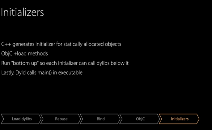 到了这一阶段,dyld开始运行程序的初始化函数,调用每个Objc类和分类的+load方法,调用C/C++ 中的构造器函数(用attribute((constructor))修饰的函数),和创建非基本类型的C++静态全局变量(通常是类或结构体)。Initializers阶段执行完后,dyld开始调用main()函数。