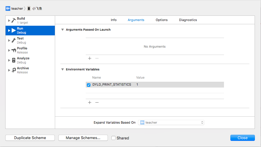 对于pre-main阶段,Xcode9之后,Apple提供了一种测量方法,在 Xcode 中 Edit scheme -> Run -> Auguments 将环境变量DYLD_PRINT_STATISTICS 设为1 :