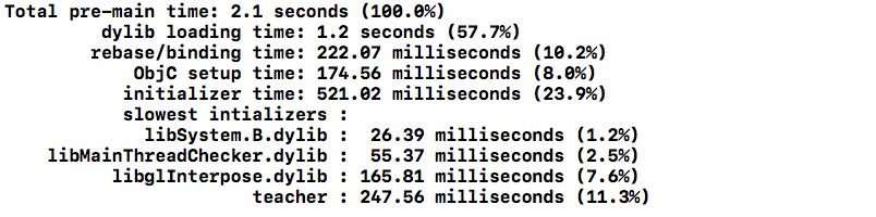 3、在初始化耗费的521.02ms中,用时最多的四个初始化是libSystem.B.dylib、libMainThreadChecker.dylib、libglInterpose.dilib以及teacher。