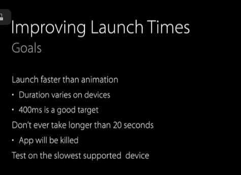 2.6、避免在用户看到的第一个界面(首页控制器或注册登录页面)的viewDidLoad和viewWillAppear做太多事情,这2个方法执行完,第一个页面才能显示,部分可以延迟创建的视图应做延迟创建/懒加载处理